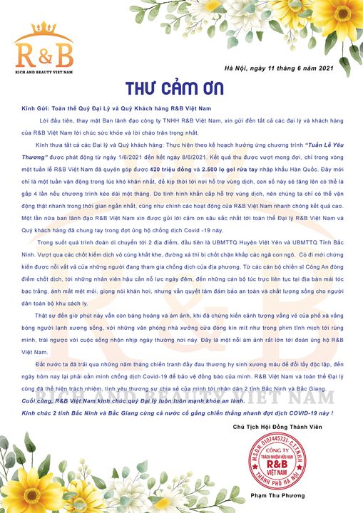 Thư cảm ơn toàn thể quý đại lý và quý khách hàng của R&B tham gia “Tuần lễ yêu thương”